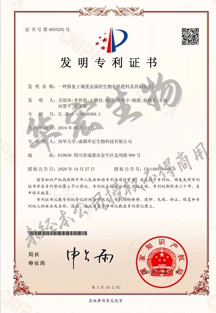 • 一種修復(fù)土壤重金屬的生物有機(jī)肥料及其制備方法專利證書(shū)